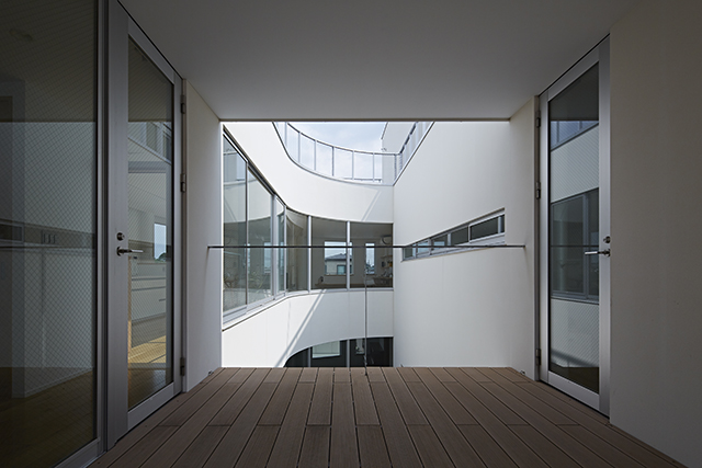 3階建ての建物は、中央の中庭を囲む輪型の平面としました。上階の住宅のどこからも中庭が見下ろせる計画です。中庭には緑の芝生を敷き、湧き水のアイコンとなる水盤を置きました。周りを囲むように歯科の治療室を配置することで、遊歩道から続いてきた穏やかな憩いの空間が、建築内にも波紋のように広がる計画としました。